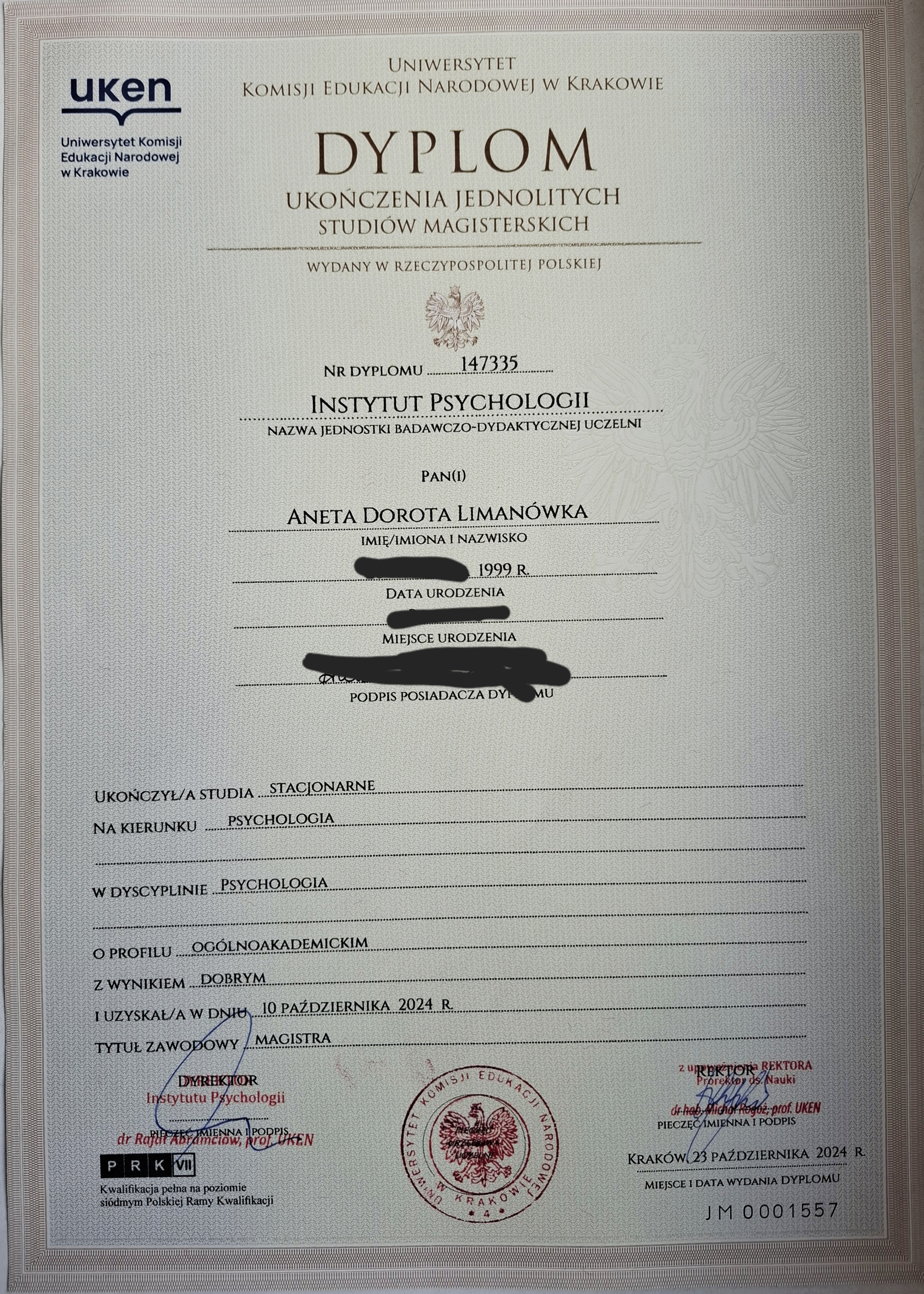 Jestem magistrem psychologii, a swoje doświadczenie zdobywałam na praktykach w przedszkolu, na obozie dla osób z autyzmem i z uzależnieniami oraz podczas codziennej pracy z dziećmi i młodzieżą. Interesuje mnie psychotraumatologia, terapia akceptacji i zaangażowania, psychosomatyka i psychodietetyka. Uznaję pracę z ciałem tak samo ważną jak z psychiką, a obie rzeczy za ściśle powiązane.