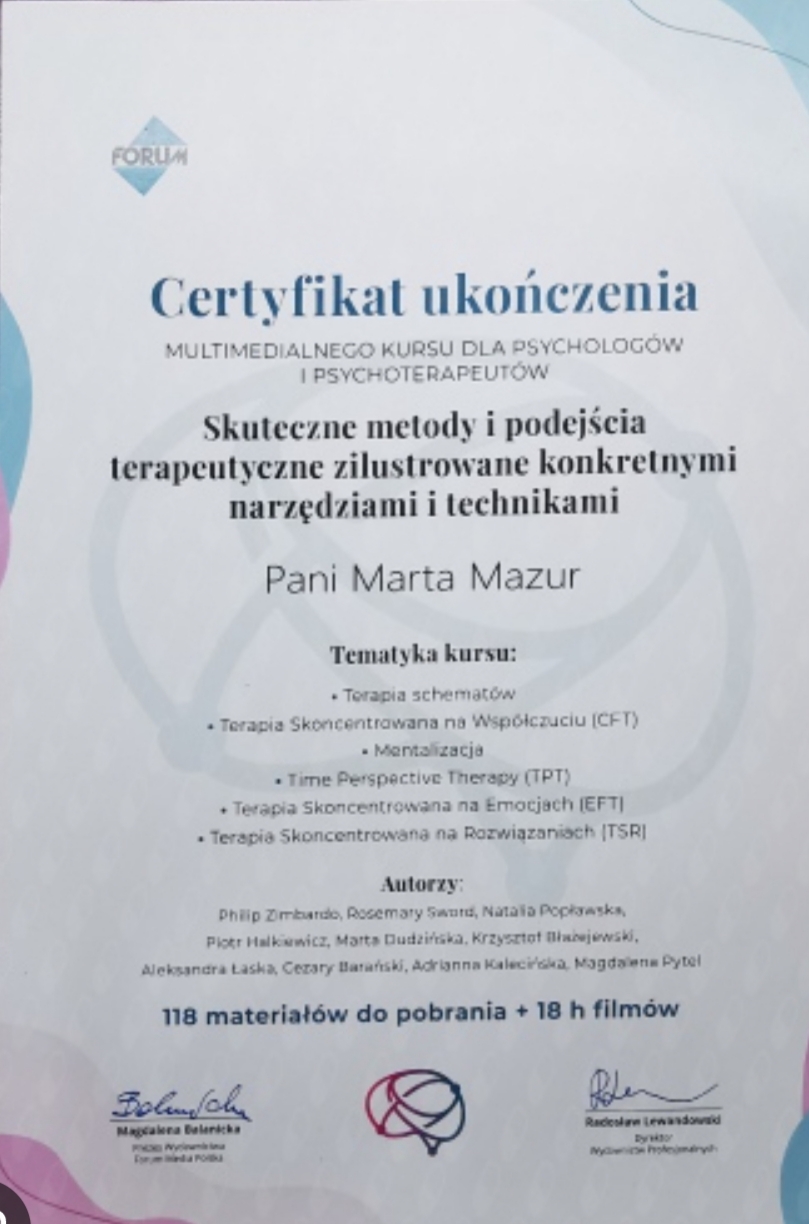 Ukończyłam studia psychologiczne ze ścieżką specjalizacją "Psychologia Kliniczna" oraz "Psychologia Rodziny". W trakcie nauki zdobyłam szeroką wiedzę. Swoją praktykę zawodową odbywałam między innymi w Szpitalu Psychiatrycznym w Gdańsku, oraz na Oddziale Onkologii w UCK. Pracowałam z osobami dotkniętymi kryzysem. Byłam psychologiem szkolnym. Cały czas pogłębiam swoje kompetencje biorąc udział w kursach i szkoleniach. W mojej pracy cenię sobie, elastyczność, swobodę ale przede wszystkim zaufanie w relacji z klientem. Pracuję w nurcie systemowym, TSR. Jestem trenerem Treningu Umiejętności Społecznych (TUS). Pracuję z osobami dorosłymi. Prowadzę konsultacje i sesje w gabinecie w Gdańsku na ul.Ogarnej lub online.