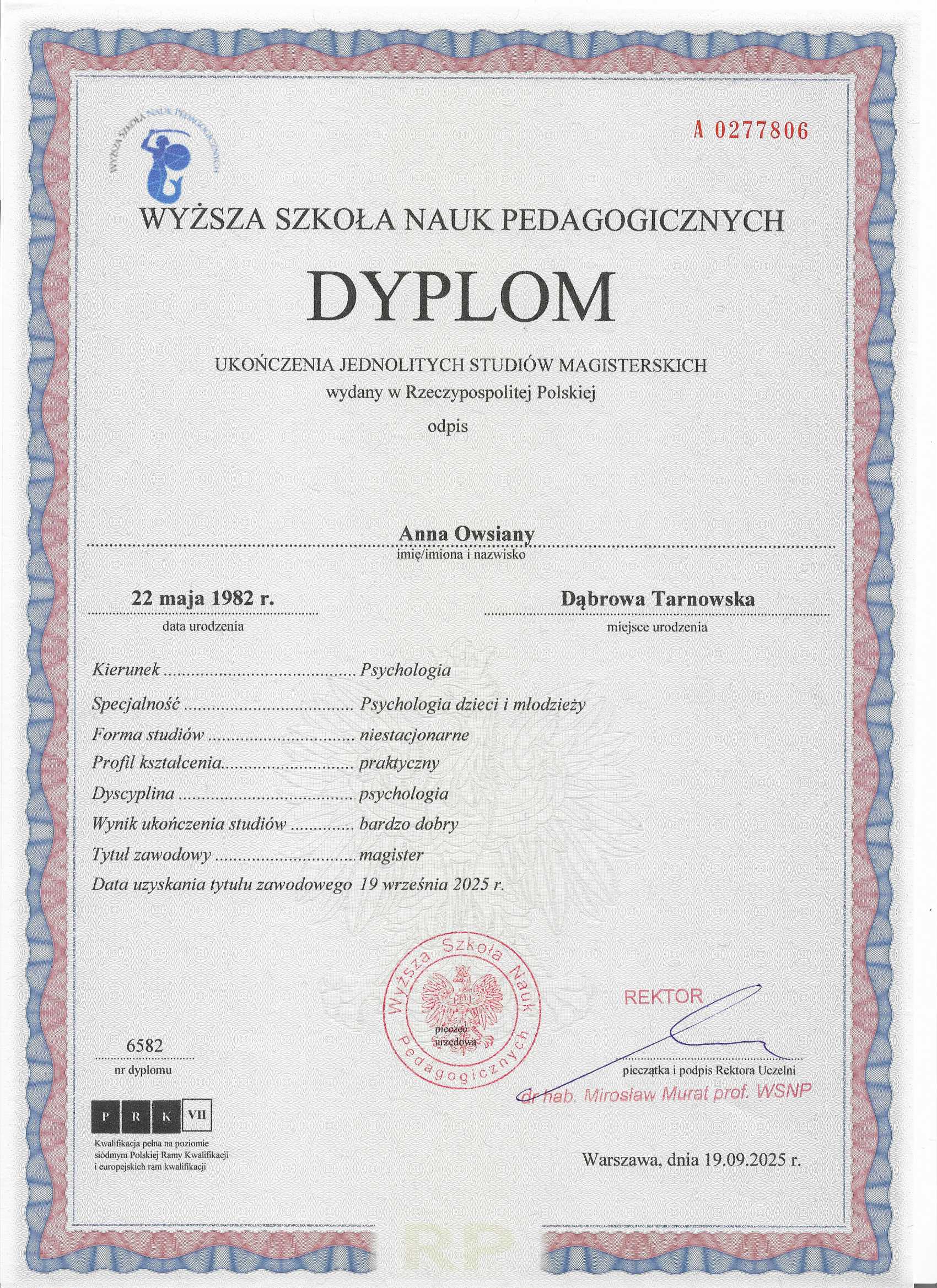 Magister psychologii, o specjalności dzieci imłodzież ANNA OWSIANY