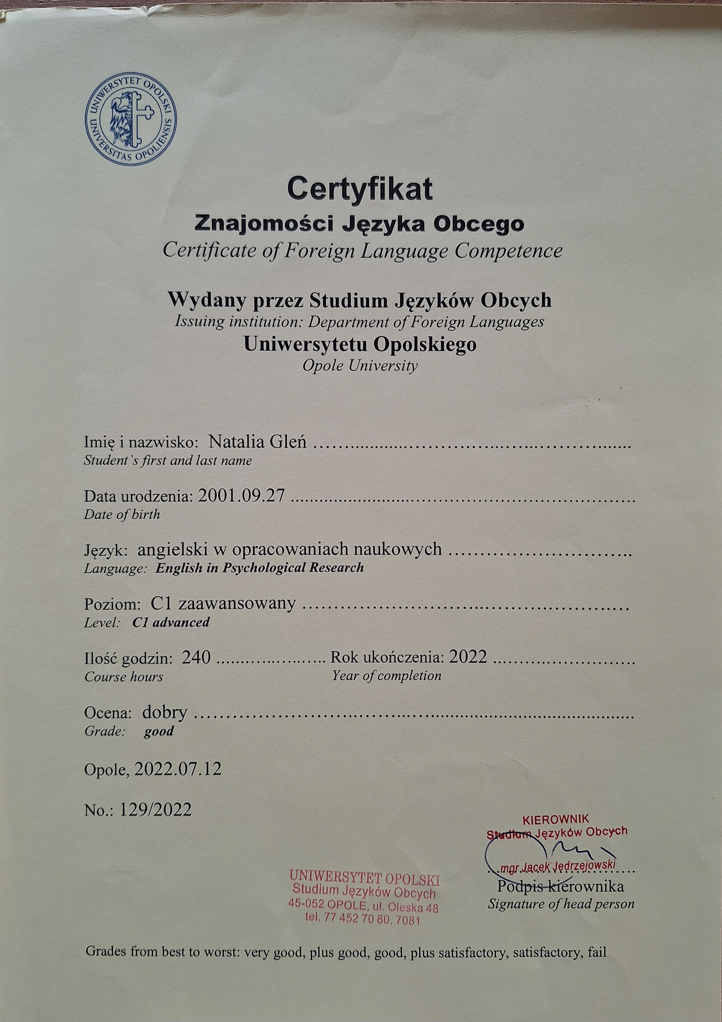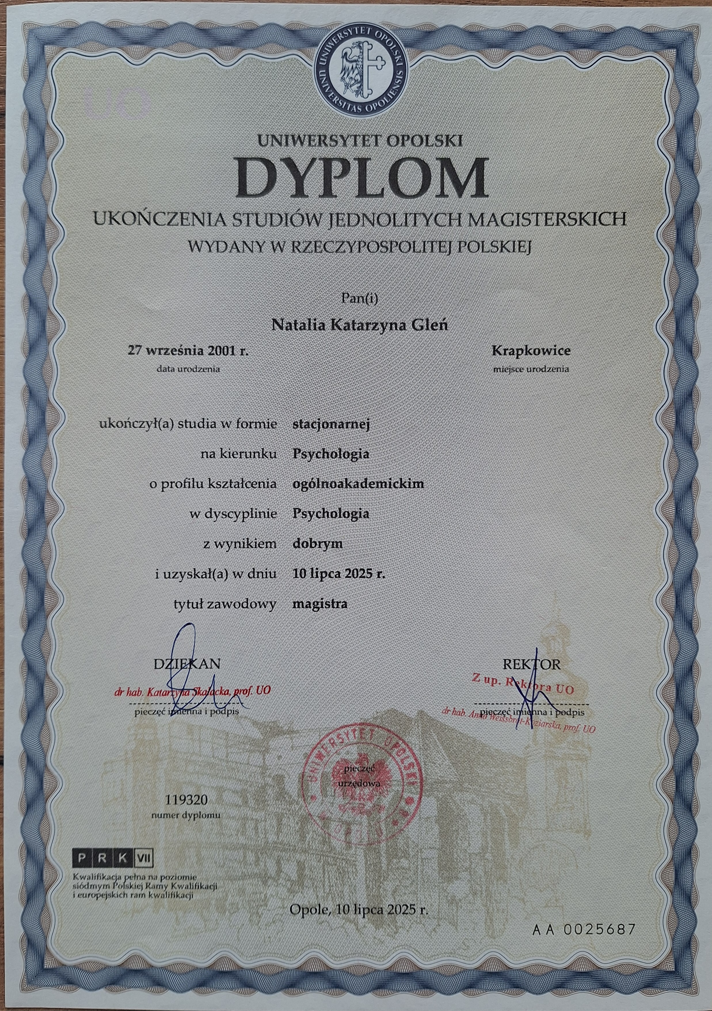 Witaj! Jestem psychologiem, który pomoże Ci z trudnościami, z którymi się zmagasz, wesprze w ciężkich momentach i udzieli pomocy, której potrzebujesz. Mam odbyte szereg szkoleń z zakresu pracy z lękiem, z pacjentem zagrożonym samobójstwem oraz posiadam uprawnienia do posługiwania się testem ASRS pomocnym przy diagnozie autyzmu u dzieci i młodzieży, a także testem Conners 3 pomocnym przy diagnozie ADHD. Przeprowadzam szkolenia oraz webinary z zakresu zarządzania stresem, wzmacnianiem pewności siebie i ogólnopojętym wellbeingu. Na codzień działam w programie EAP (wsparcie pracowników). Oprócz tego kończę studia z dietetyki, którą łączę również w swojej pracy.