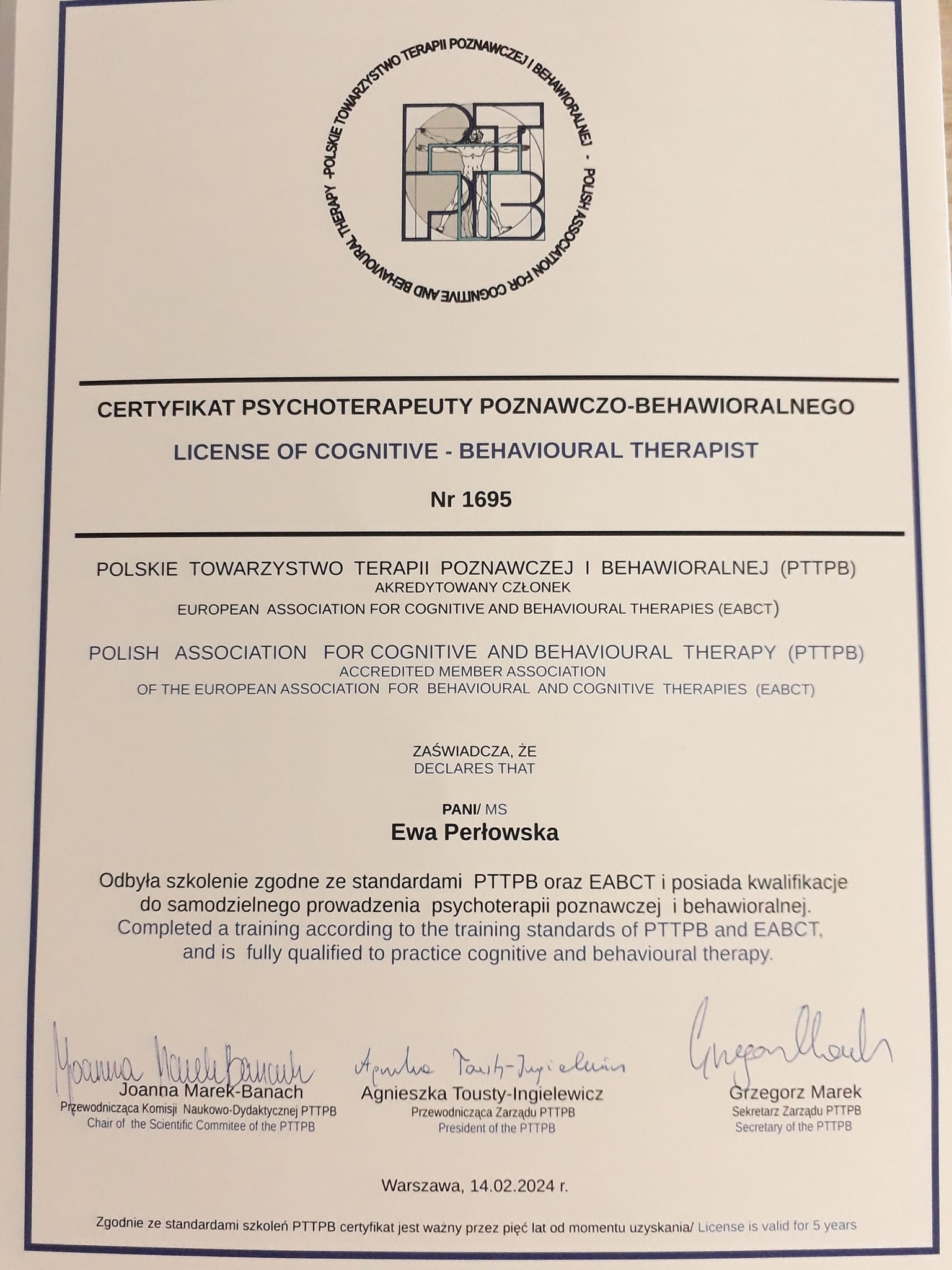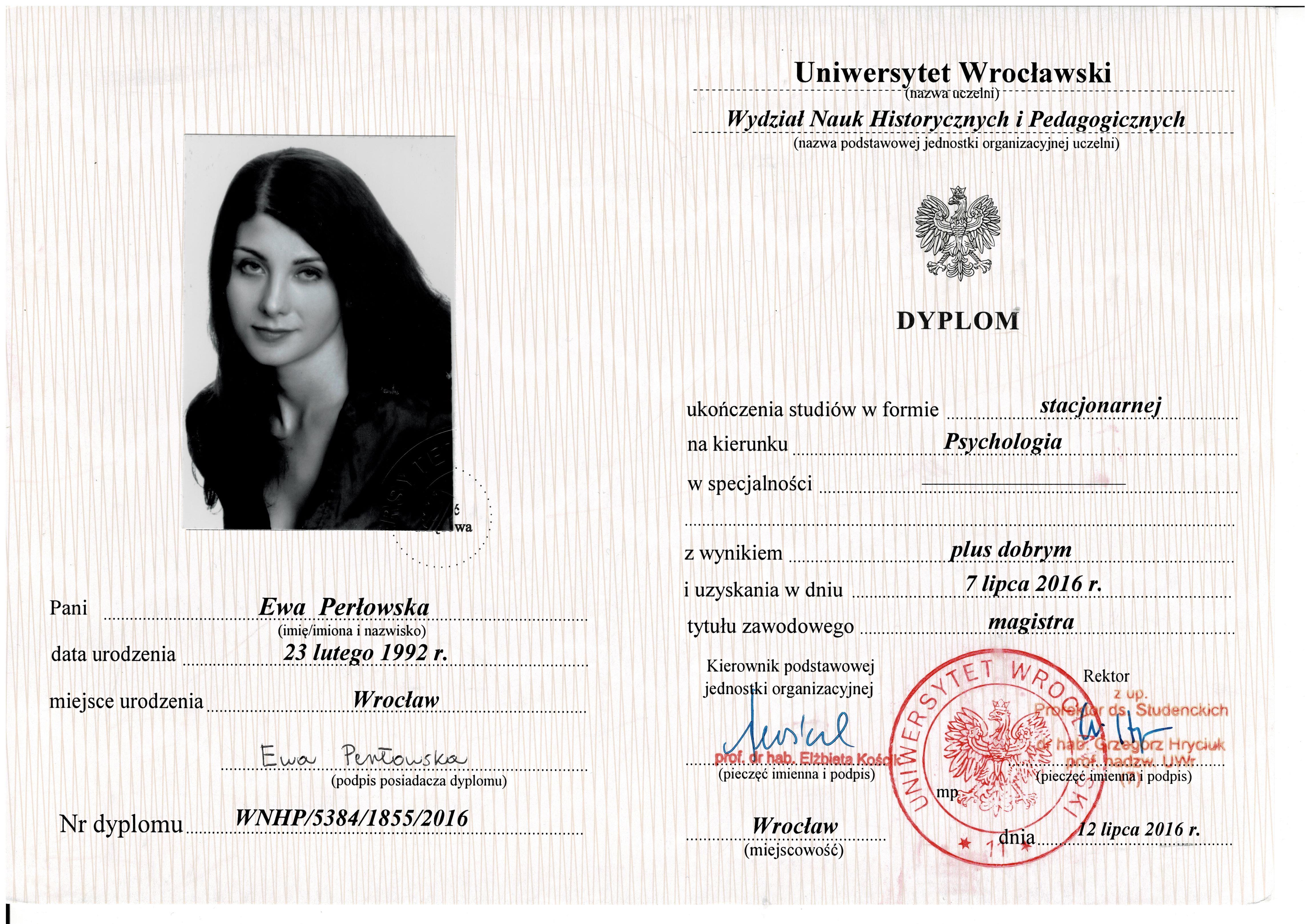 Ukończyłam psychologię na Uniwersytecie Wrocławskim, oraz czteroletni kurs psychoterapii w Centrum CBT w Warszawie. Stale doskonalę swój warsztat pracy podczas szkoleń oraz regularnych superwizji. Jestem członkinią Polskiego Towarzystwa Terapii Poznawczo-Behawioralnej, pracuję w oparciu o Kodeks Etyczny Towarzystwa. Oprócz podejścia poznawczo-behawioralnego, w swojej pracy wykorzystuję również elementy terapii schematów oraz innych narzędzi tzw. trzeciej fali.