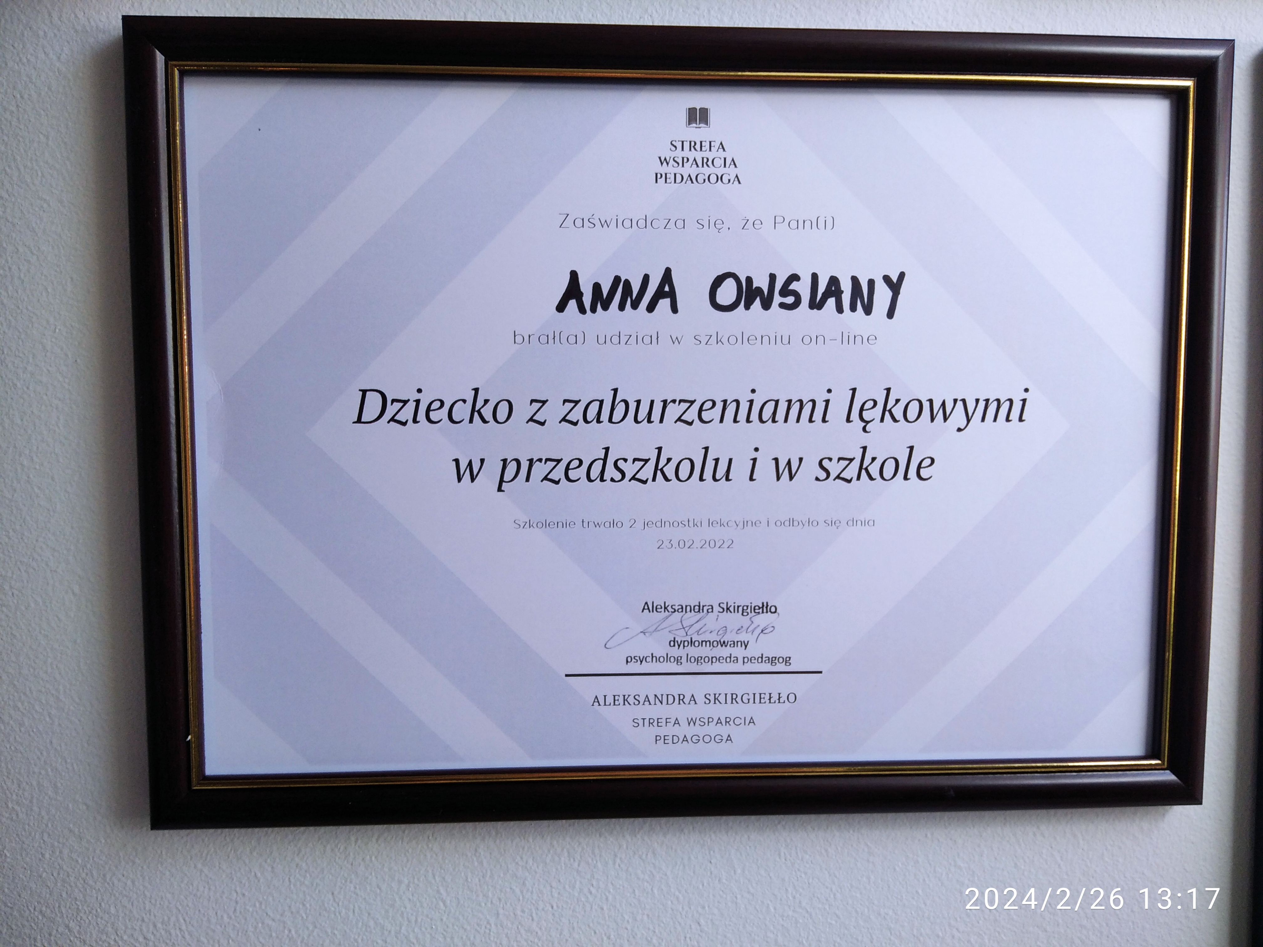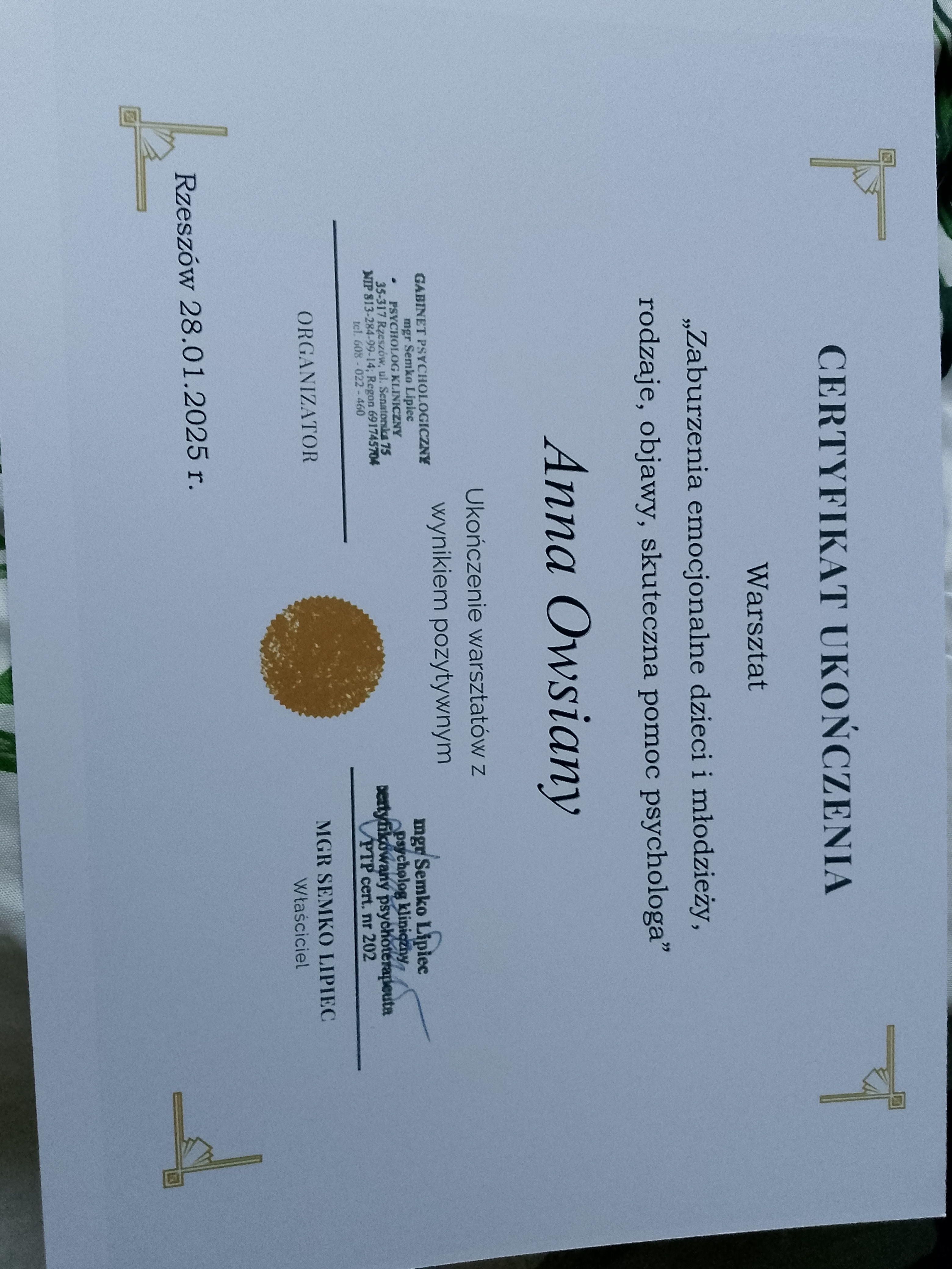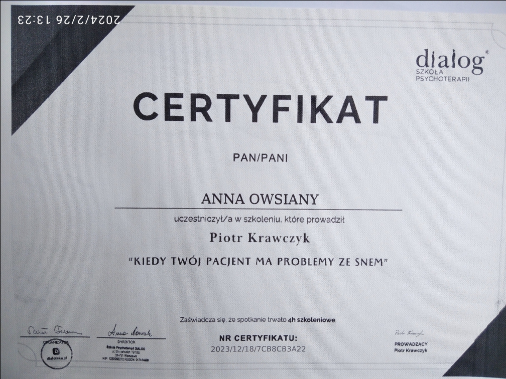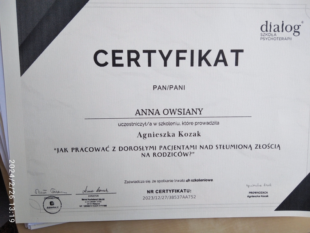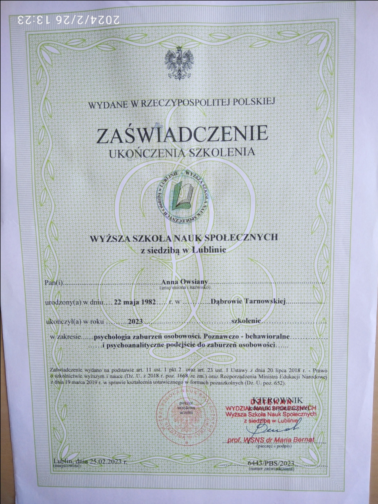 Magister psychologii, o specjalności dzieci i młodzież, Magister nauk o rodzinie, Magister pedagogiki resocjalizacyjnej z terapią uzależnień Anna Owsiany