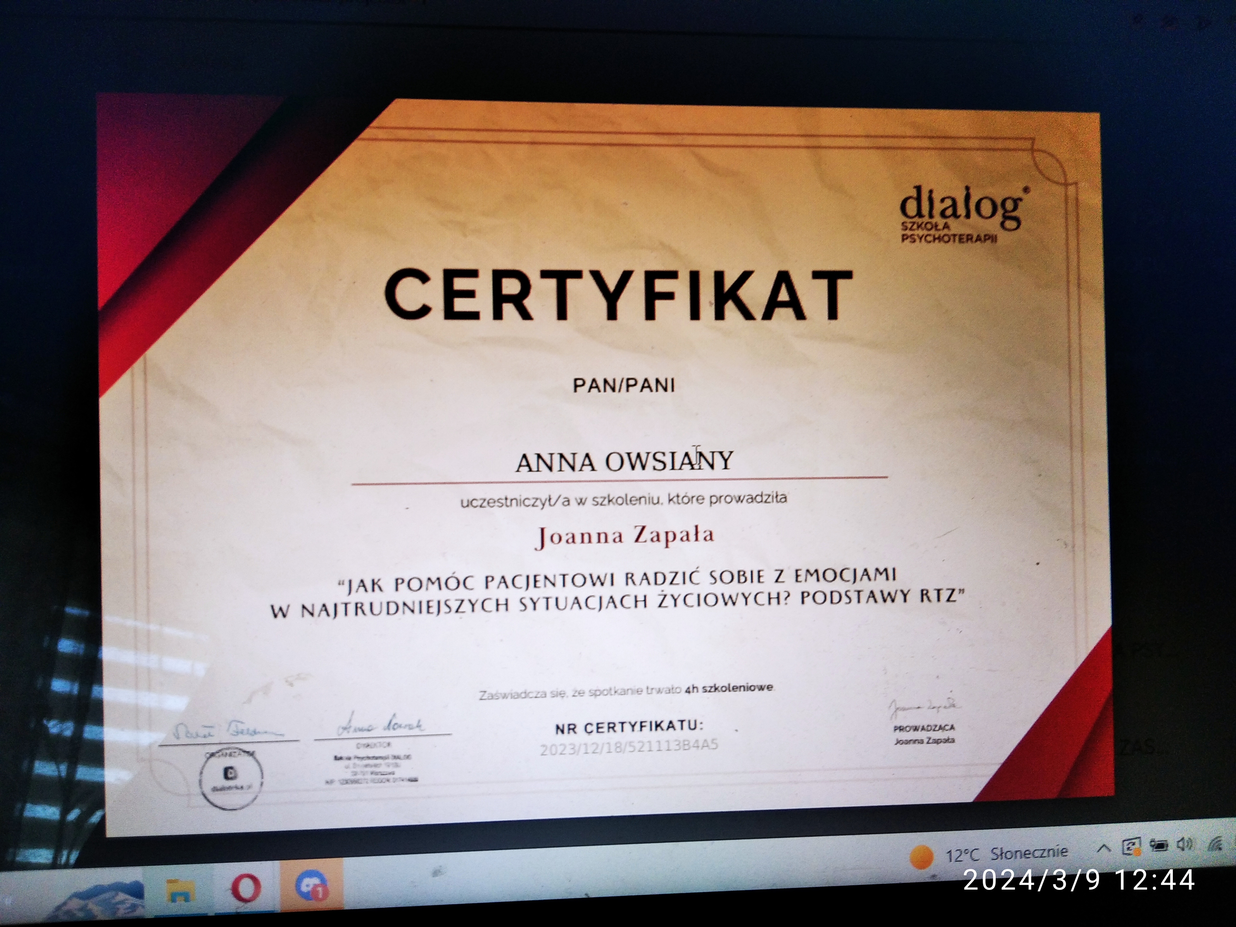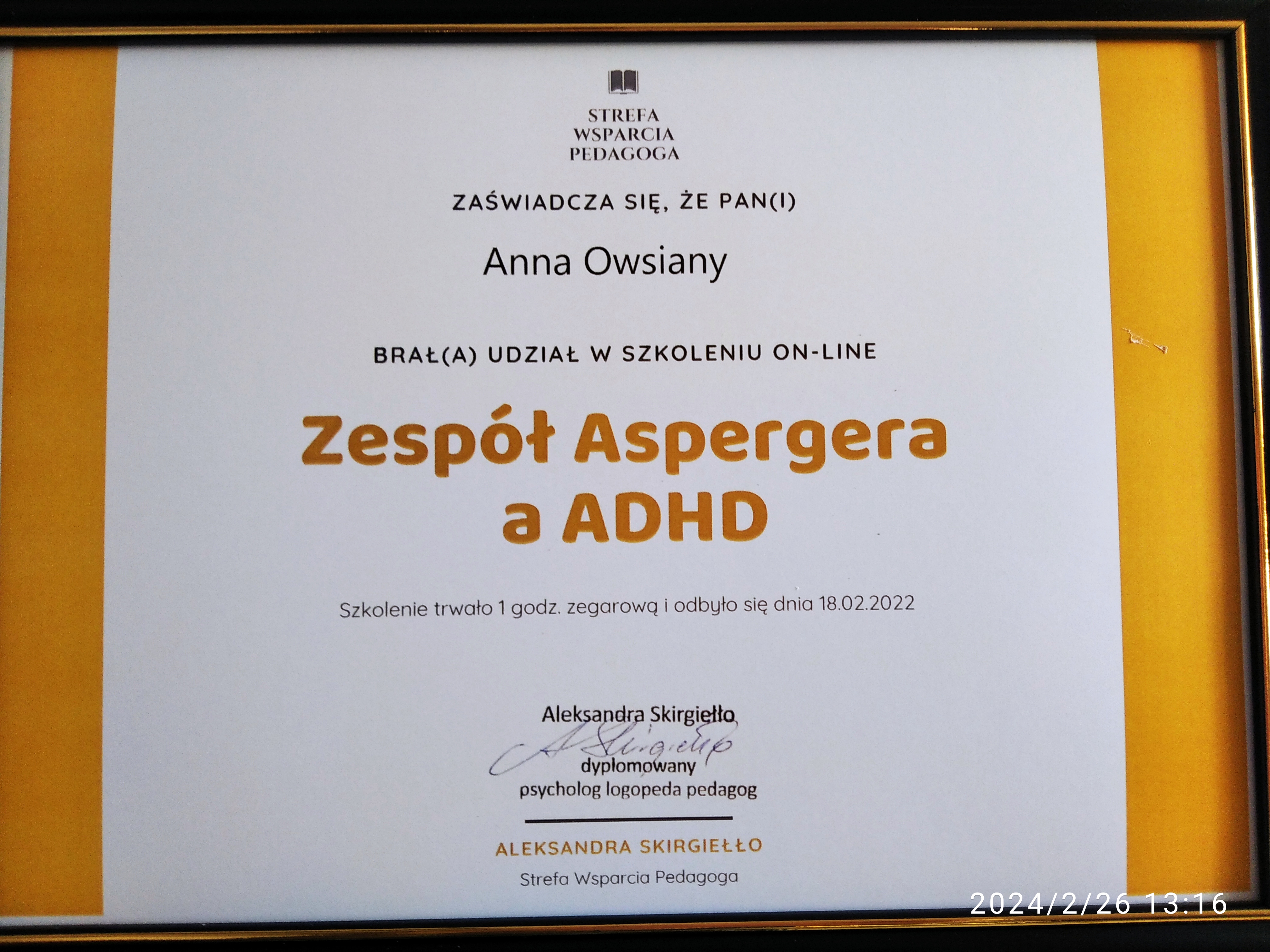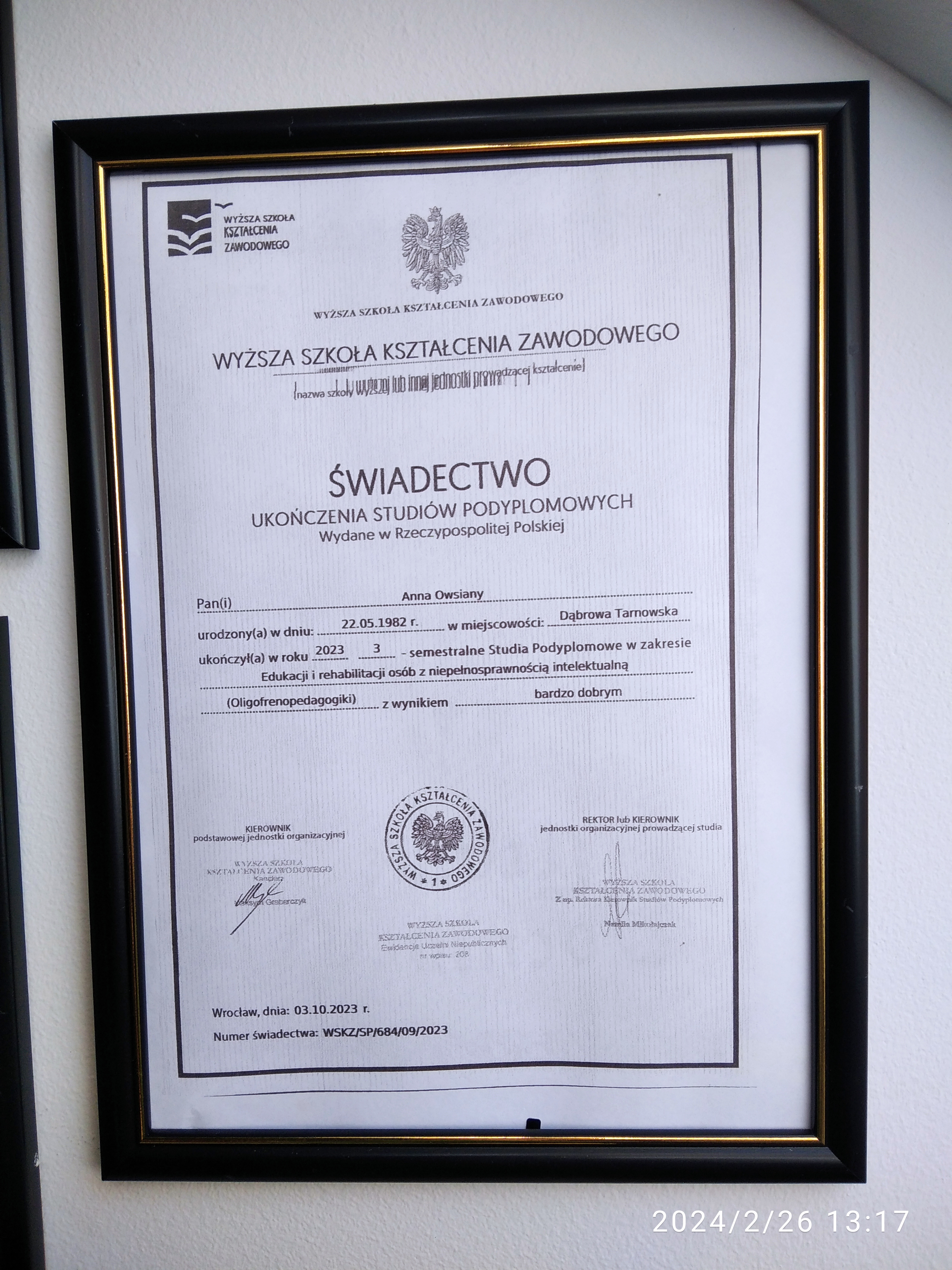 Magister psychologii, o specjalności dzieci i młodzież, Magister nauk o rodzinie, Magister pedagogiki resocjalizacyjnej z terapią uzależnień Anna Owsiany