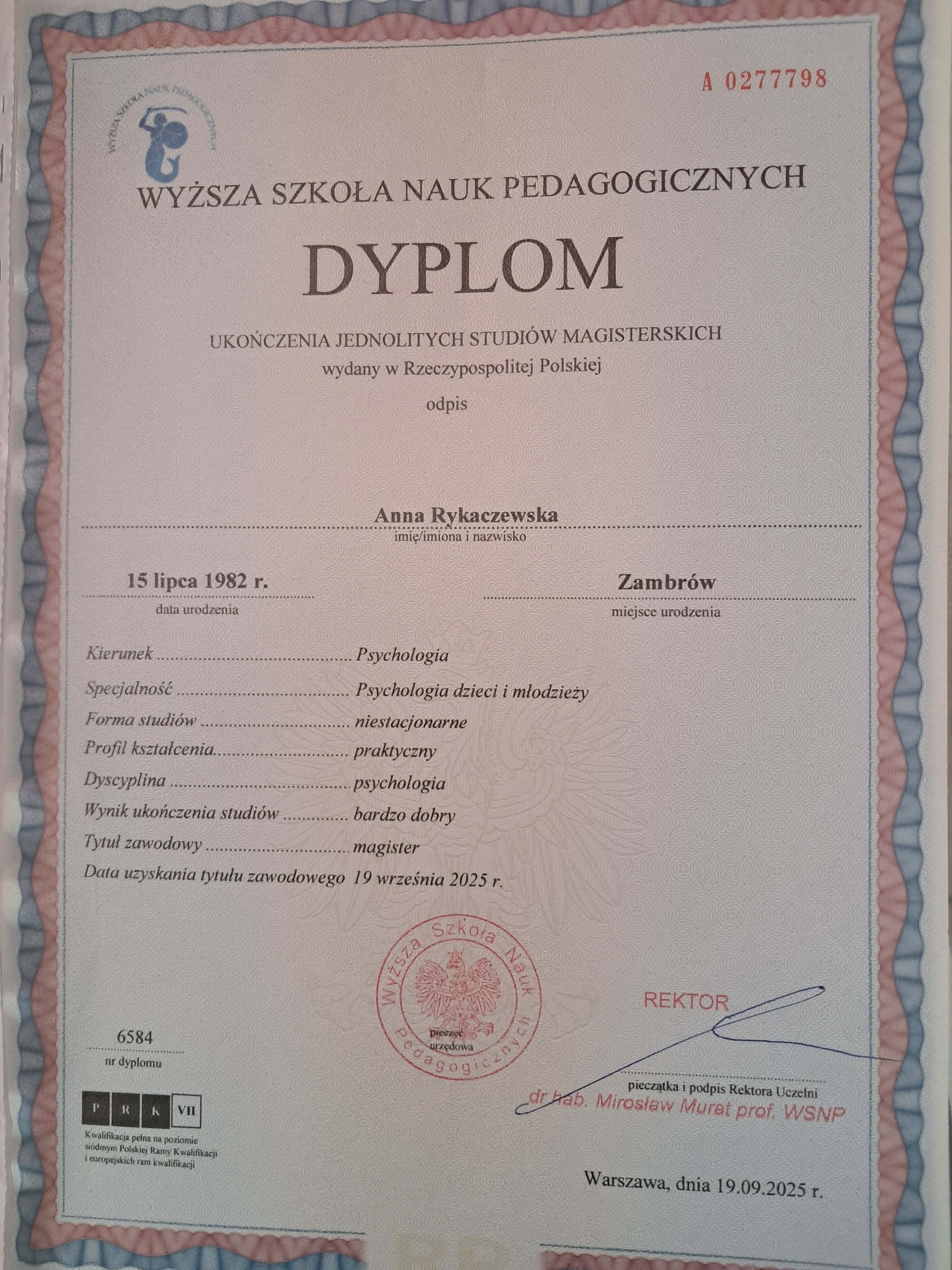 Jestem psychologiem ze specjalnością psychologii dzieci i młodzieży, pedagogiem specjalnym, oligofrenopedagogiem, wykładowcą akademickiem, trenerem. Codziennie wspieram dzieci i młodzież z trudnościami rozwojowymi, emocjonalnymi oraz specjalnymi potrzebami edukacyjnymi , łącząc rzetelną wiedzę psychologiczną, doświadczenie i praktykę w codziennej pracy zawodowej.